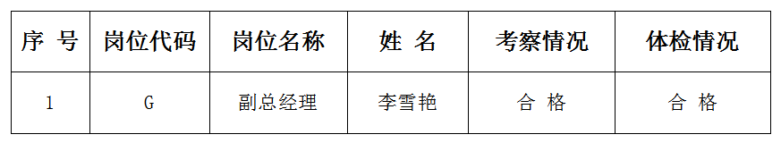 根据《滨州市财金投资集团有限公司2022年公开招聘国有企业工作人员简章》的规定和相关要求,经网上资格审核、笔试(部分岗位)、面试、面谈、考察、体检等程序,确定李雪艳为拟聘用人员。现进行公示,公示期限:2022年10月27日至11月2日。
