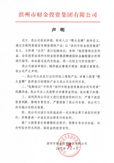 近日,我公司收到举报,称有人以"馒头直聘"软件名义, 通过互联网渠道宣传销售理财产品;以"滨州市财金投资集团" 名义,与所谓"会员"签订包赔协议,宣称"高度重视会员利益,会员投资由滨州市财金投资集团聘请国际金融数据分析师进行指导,如未能完成约定收益,将一次性支付所有款项"。