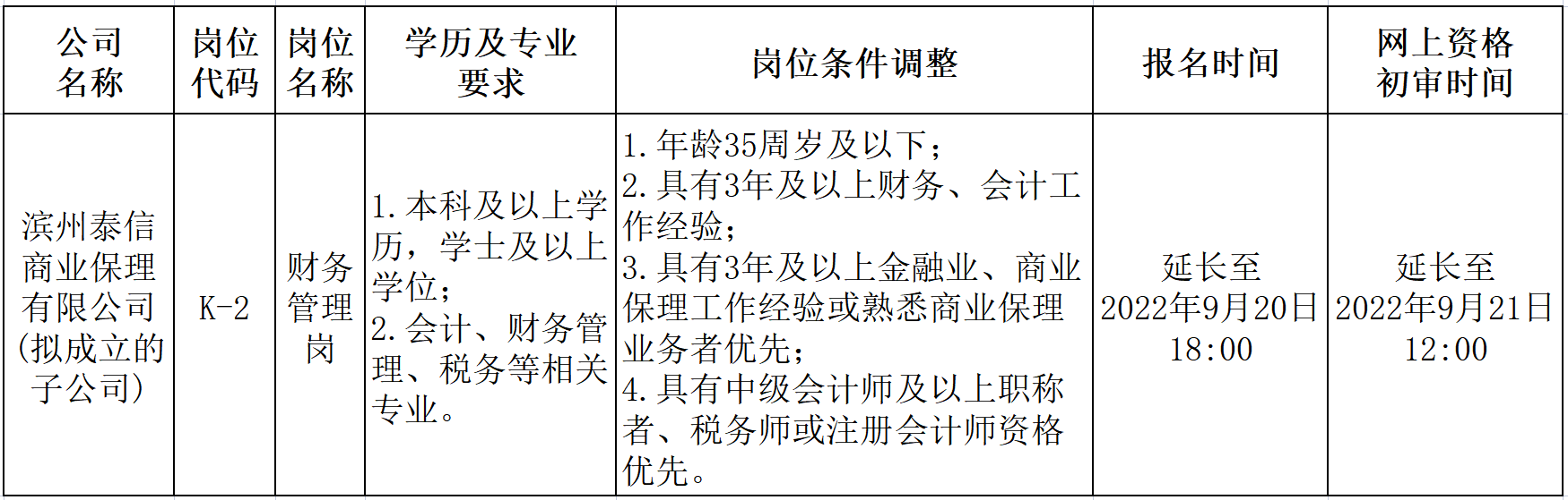 我公司于2022年09月01日发布的《滨州市财金投资集团有限公司2022年公开招聘国有企业工作人员简章》,根据工作需要,结合报名情况,经研究决定将部分岗位招聘条件和报名时间调整如下: