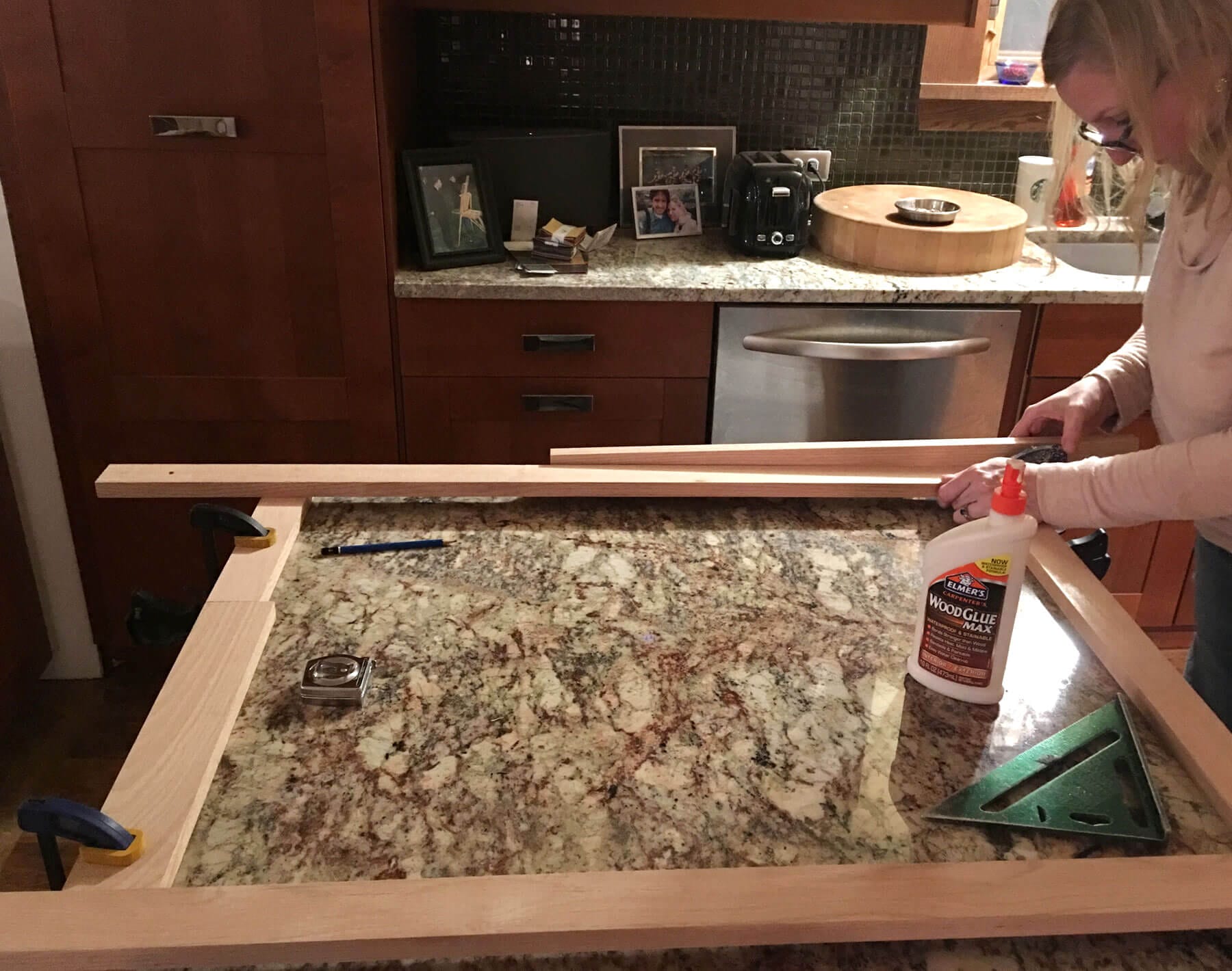 Once the boards are cut and the hardware is procured, it's time to get building, and you'll want to make sure you have plenty of space to work. The longest of the boards is well over 6 feet, so it's not something you can do in a closet. Also, some kind of sturdy table will be a real asset so you can clamp the boards down to something while you glue and nail them together. We made heavy use of our kitchen island for this purpose – just take care that you don't damage your furniture.