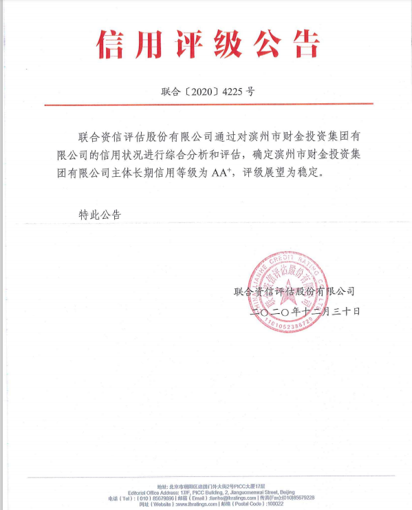 近日,国内权威评级机构联合资信评估股份有限公司授予滨州市财金投资集团有限公司AA+信用等级,评级展望为稳定,目前为全市各类企业最高等级。