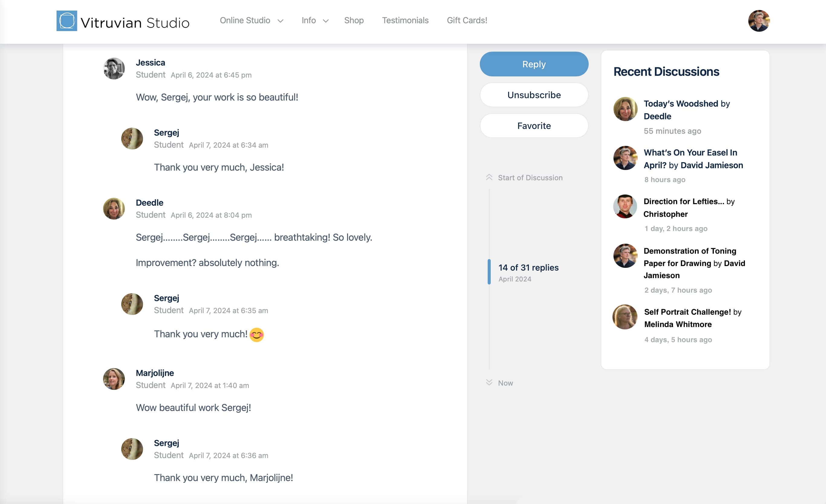 Members of the community have access to a library of photo references, a community forum for discussion and sharing, our back-catalog of live streaming class recordings with over 72 hours of content (with more added regularly), and sneak peeks at artwork in progress shared by Vitruvian Studio instructors. With an optional critiques add-on, students can book one-on-one Zoom meetings with instructors for personalized feedback on their work, which is helpful both for learning and for staying motivated.