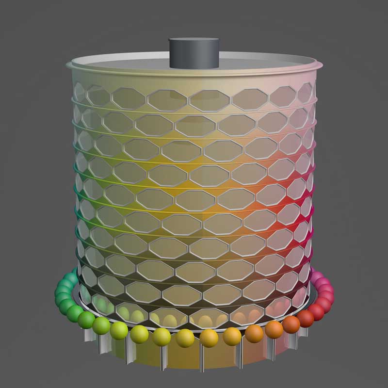 The true shape of color space is asymmetrical. This is because different hues have different maximum chromas at different values, resulting in a space resembling a squished, lopsided sphere. But to keep things simple, let's think of color space as a kind of cylindrical building, in which all possible colors “live” in particular locations. Every color has a specific address inside color space.