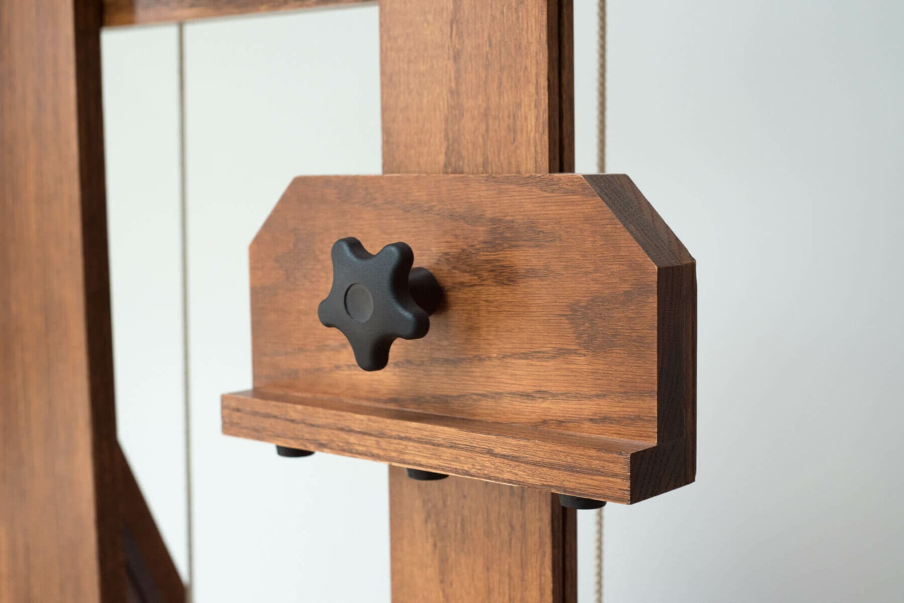 The Cadmium's signature feature is a counterweight system that allows for adjusting the height of the easel with "fingertip ease". To accommodate the mechanism, the easel sports a compound frame – an outer stationary fame which supports most of the weight, and an inner "slider" frame that moves up and down on a tongue-and-groove track. To counterbalance the weight of the slider (which carries with it the center mast, painting supports, the taboret, and your artwork), the plans suggest using barbell plates suspended on a simple rig of ropes and pulleys – as the slider moves up, the weight moves down and vice-versa, much like how an elevator works. The overall effect is that when adjusting the height of the slider, the whole assembly feels lighter than it actually is because the counterweight provides a nice assist.