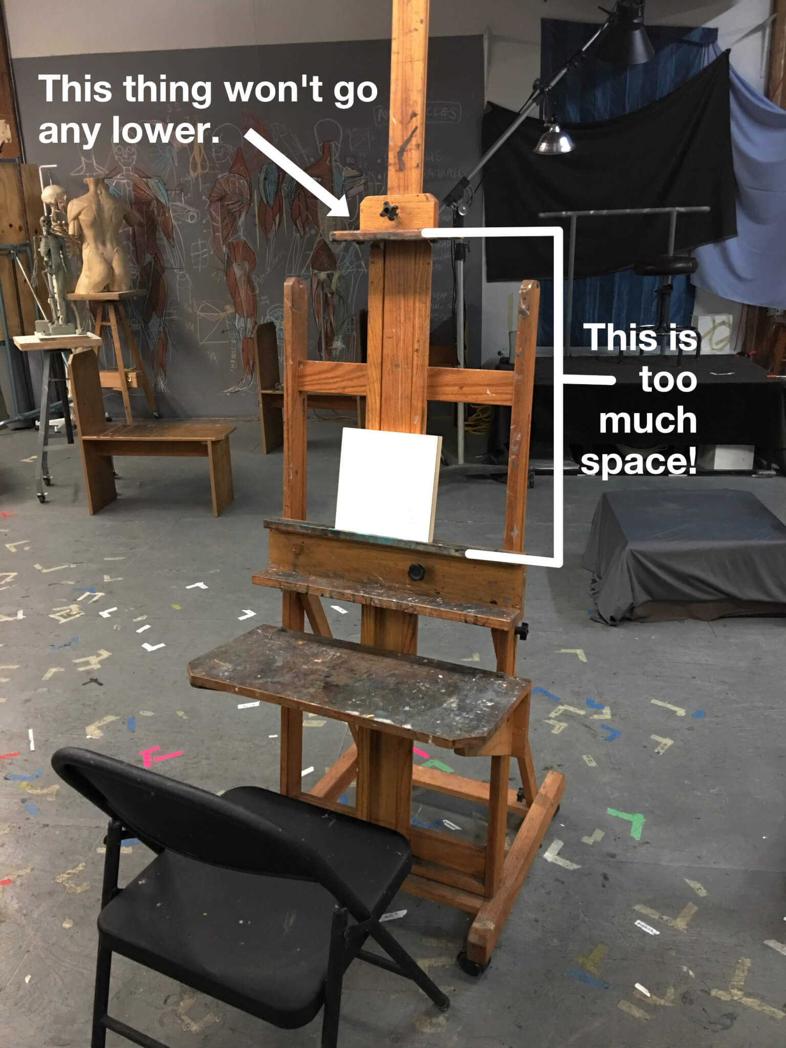 And yet, it's not quite working for either of us. Speaking for myself, drawings and paintings unfold gradually over time, and whenever I have to surrender my easel it feels like an interruption. Imagine if a musician had to swap instruments – arbitrarily, over and over – during a recital. It would be weird and disruptive and would diminish the performance. Call me selfish, but I want to have an easel that nobody uses but me – one that stays put, set up just the way I like it, and doesn't get dragged around the room and messed with before every new class session.