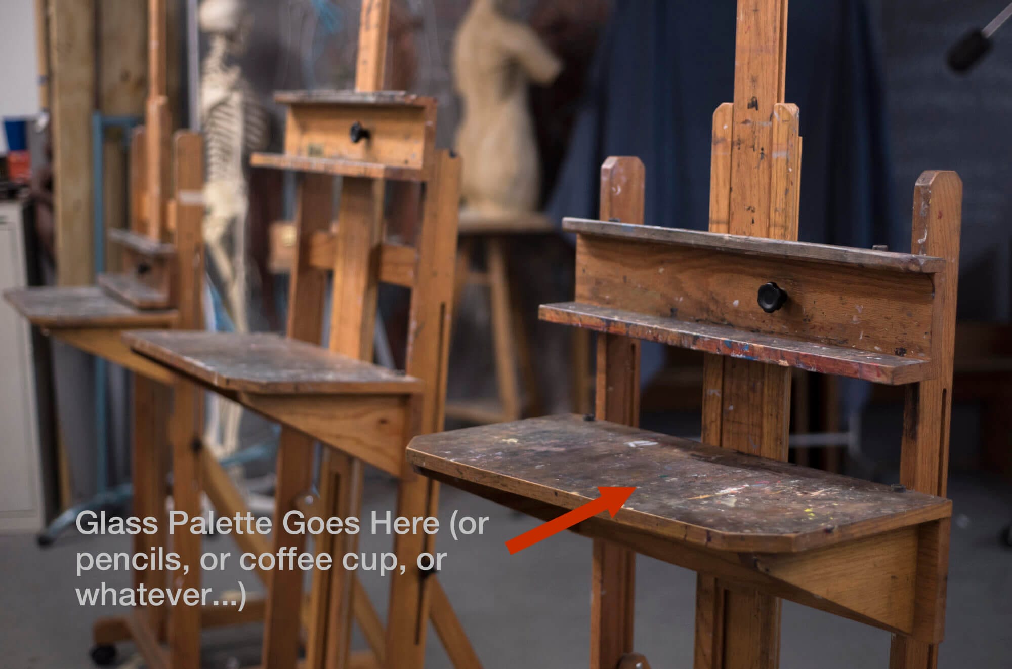 My wife Mindy and I have used the Vitruvian space as our own studio since we opened. Whenever one of us needs an easel, we simply grab one from the general population, set it up somewhere in the studio, and use it there until the next class starts, when it gets sent back into circulation for students. This has worked for years and we can't really complain – we get to choose from a whole roomful of easels whenever we want. How many artists get to do that?