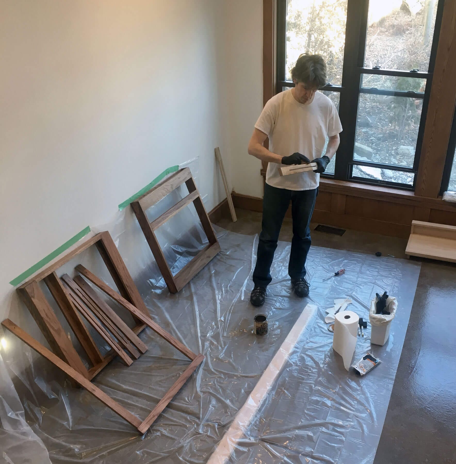 There are other variables to consider. The taboret shelf is optional, and is also one of the more complicated components of the design. You could choose to omit it and save yourself some time. You could also choose to paint your easel instead of stain it. We opted for stain, but that requires subsequent applications of a clear-coat finish. Three coats of polyurethane looks beautiful, but it does add to the completion time for the project – each coat has to be dry and sanded before the next one is applied. It turns out that wood finishing is a bit of an art form in its own right, so I spent some additional time absorbing YouTube videos on the subject before attempting it myself.