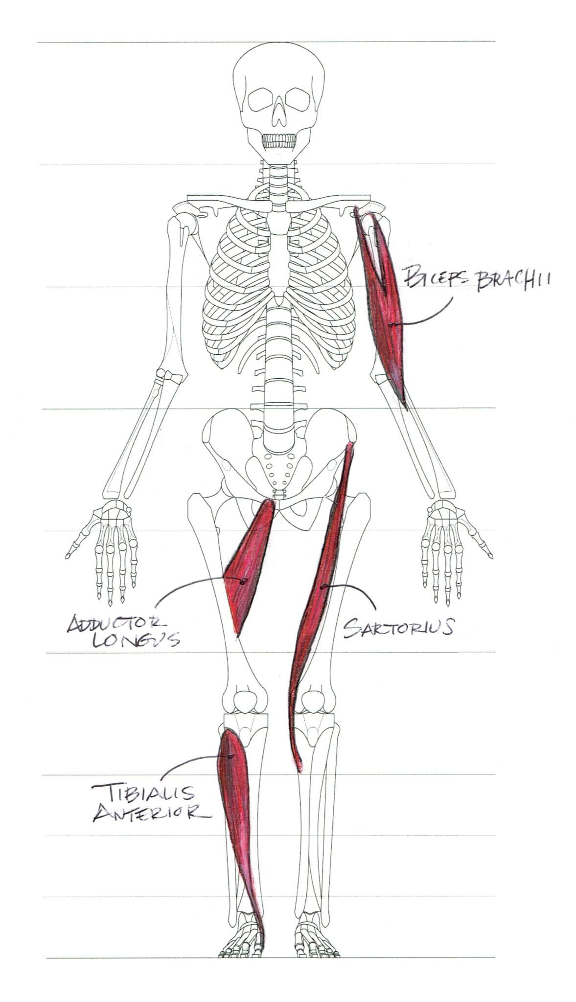 If you do leave space between a skeletal volume and the outer contour of the figure – as would be appropriate, say, when drawing the femur inside the thigh – you must be prepared to account for the distance between them. There are very specific muscle forms, in very specific groupings, that fill-up that space all they way to the surface of the skin. The space inside the contour of the figure must be considered the way a bookkeeper works in a ledger – there are no “floating” or “empty” entities. Everything must be accounted for.