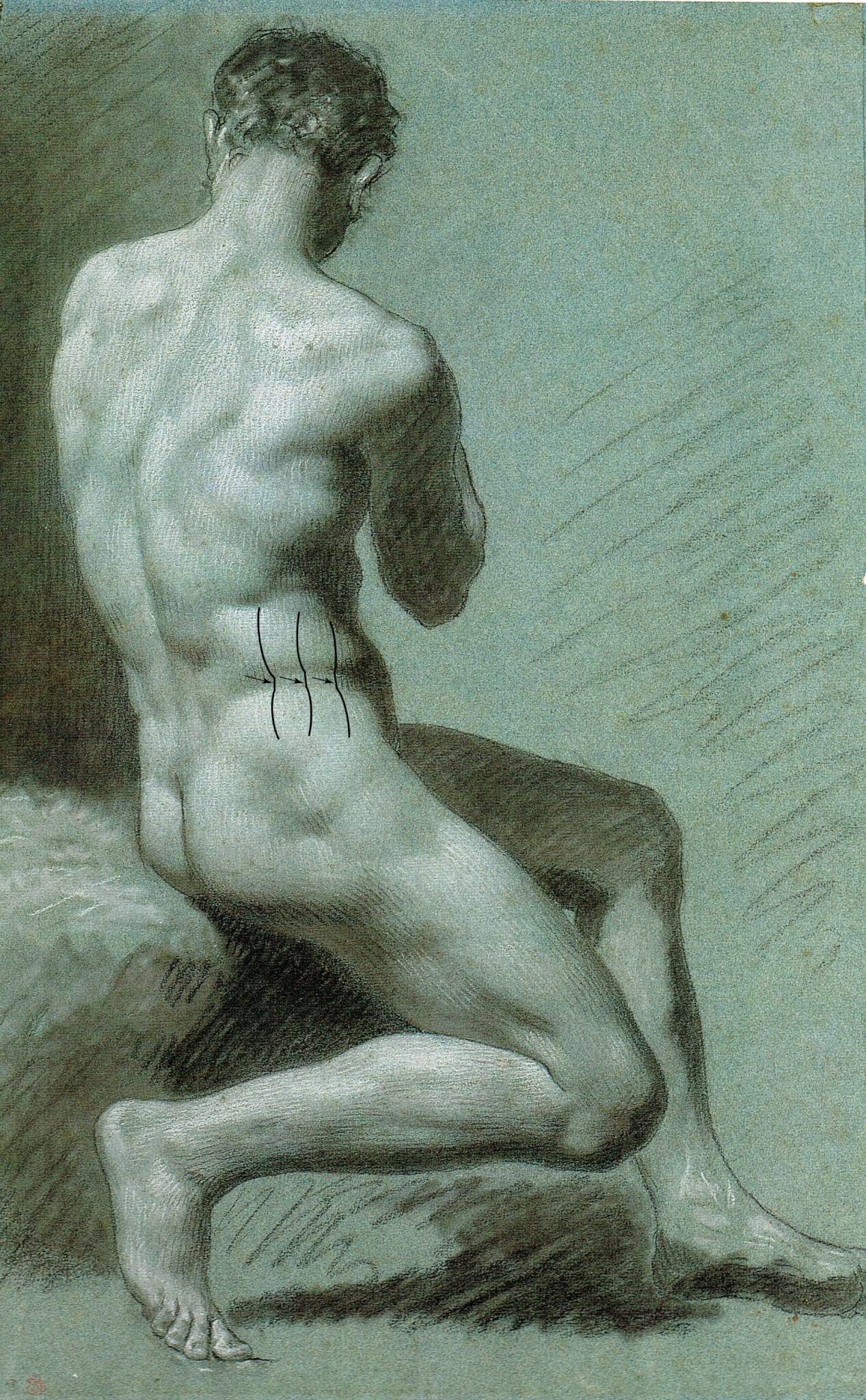 Prominent convexities on the contour are rarely seen right next to one another. Instead, any two full forms tend to be separated by a flatter “spacer” form, serving as a kind of “rest stop” on the contour. This idea can be seen in subtle ways all over the figure. For example, the two pectoralis muscles of the chest are separated by the flatter form of the sternum between them. Similarly, the iliac crest of the pelvis separates the full forms of the external oblique above and the gluteus medius below.