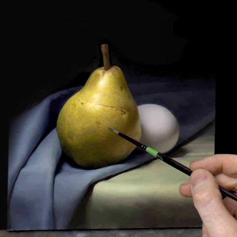 I just completed the Still Life course with you on-line and I am so satisfied with the process you created. First, it felt like I could have been in the studio with you as you took a relaxed approach carefully explaining each step and giving many worthwhile tips. While it felt relaxed it was also demanding and that was good because it really made me focus on the task and to look ever so carefully at the piece I was painting. There were two other important aspects of this course; great patience and clear directions. Your skill as a teacher is matched by your wonderful artistic accomplishments. So thanks again. While I am not entirely satisfied with my results I know I can do better going forward thanks to you. Here is a photo of my Pear and Egg work and of the portrait drawing course that I took some time ago with you. Best wishes, Wayne